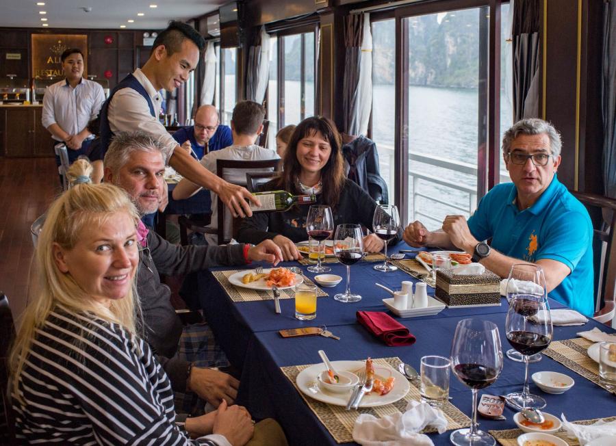 12:40-14.00 Enjoy lunch with Vietnamese and International dishes served while cruising in the magnificent Halong Bay, admiring the fascinating rock formations in the bay.