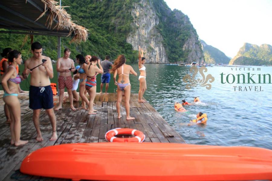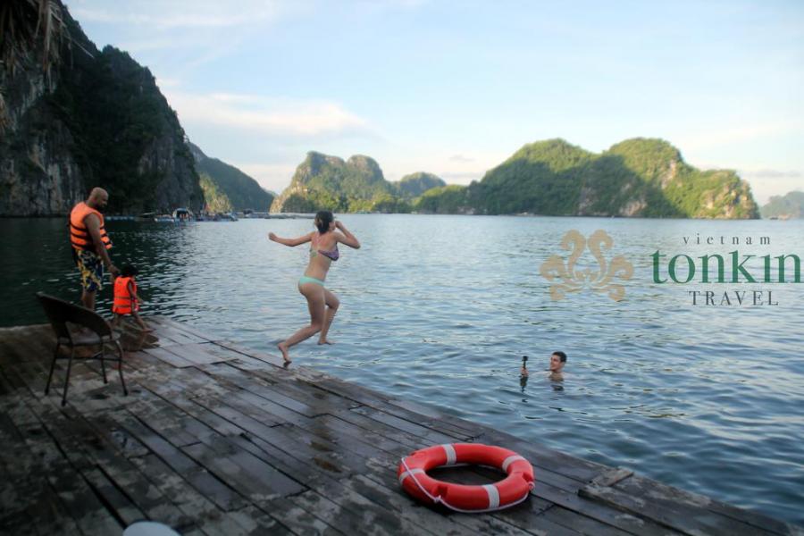 • Passing many beautiful landscapes in Halong bay: Ba Hang fishing village, Dog rocks, kissing chicken rocks, Dinh Huong islet, Titop island beach, pearl farms, Lan Ha Bay.