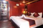 Cabin facilities: Comfort bed with linens, Air-con, Private Bath, and rustic rattan furnishings, lights, window with curtains and pictures