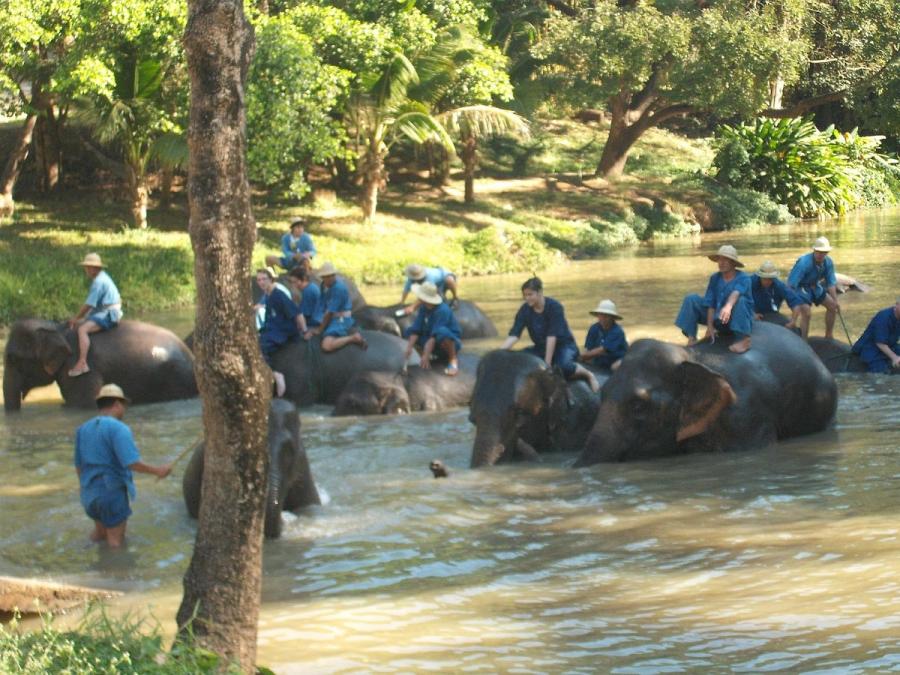 Lunch is served at one of the viewing platforms. You have some time to let everything sink in. Following the forest picnic, you can see the resident mother and baby at the nursery. The mahout of the mother stays close by while she and her baby have a bath and play. The mother trusts him around her offspring and even lets him play with her a little bit. Afterwards, board our boat for a trip back to the center in time to see the afternoon bath. You will meet our veterinarian or biologist again as they will conduct a target training session. All our elephants are being trained using ‘positive reinforcement’ techniques to facilitate any necessary treatments. We offer you the chance to follow their work from a safe distance. Afterwards you can walk the elephant back to the forest.